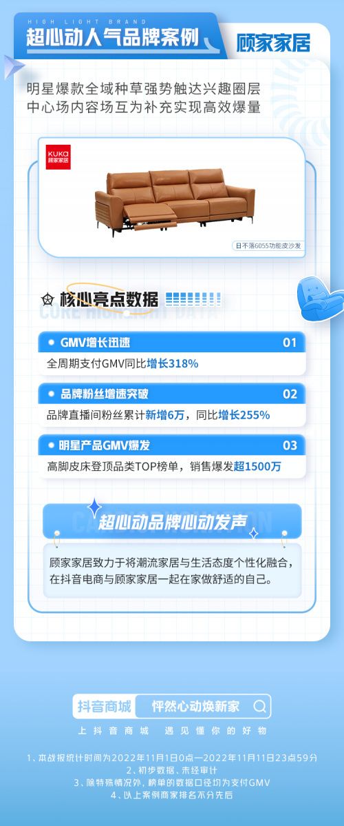 以顾家家居为例,商家通过在抖音电商中心场及内容场全域多维发力,精准拓宽用户圈层,实现高效爆量。至活动结束,顾家家居全周期支付GMV同比增长318%,品牌直播间粉丝累计新增6万,同比增长255%,明星单品登顶品类TOP榜单,销售额超1500万。