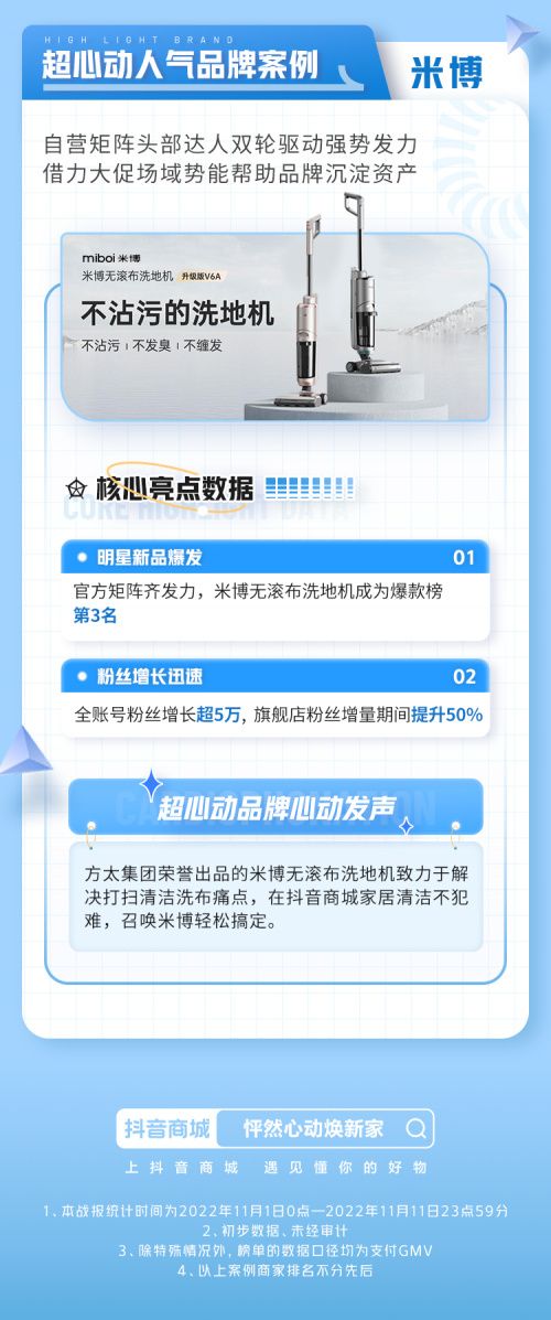 当下,伴随大众接受信息触点的增多,消费者的注意力也愈发分散。如此,在与同品类产品竞争中,产品具有的差异化卖点更亟需精准传递,高效激发用户兴趣。活动中,MIBOI米博便通过测评、情景式种草等多种角度的短视频不断强化MIBOI米博洗地机无滚布的核心卖点,捕获用户关注。同时,在直播过程中,又通过主播口播、背景板文案等形式强调MIBOI米博为方太旗下的新品牌这一核心要素,赢获消费者信赖。最终,MIBOI米博无滚布洗地机成爆款榜第三名,全账号粉丝增长超5万,MIBOI米博官方旗舰店粉丝增量期间提升50%。