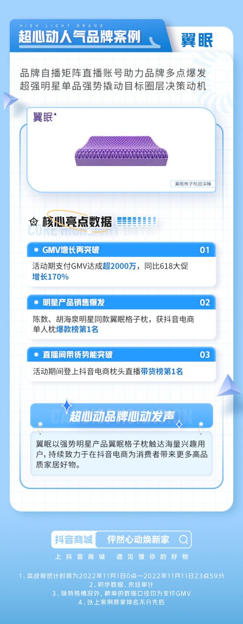 通过聚焦能为用户带来高质量睡眠这一核心卖点,翼眠在抖音全域兴趣电商多维、多频发力,精细化覆盖兴趣用户群体。活动期间,翼眠联合明星胡海泉多角度呈现翼眠枕核心卖点,并发起肺活量挑战赛,撬动更多潜在用户圈层关注。至活动结束,翼眠实现了单品格子枕获得抖音电商单人枕爆款榜第一名,抖音电商枕头直播间带货榜第一名佳绩。同时,品牌在抖音电商的GMV同比618大促增长170%,活动期支付GMV突破2000万。