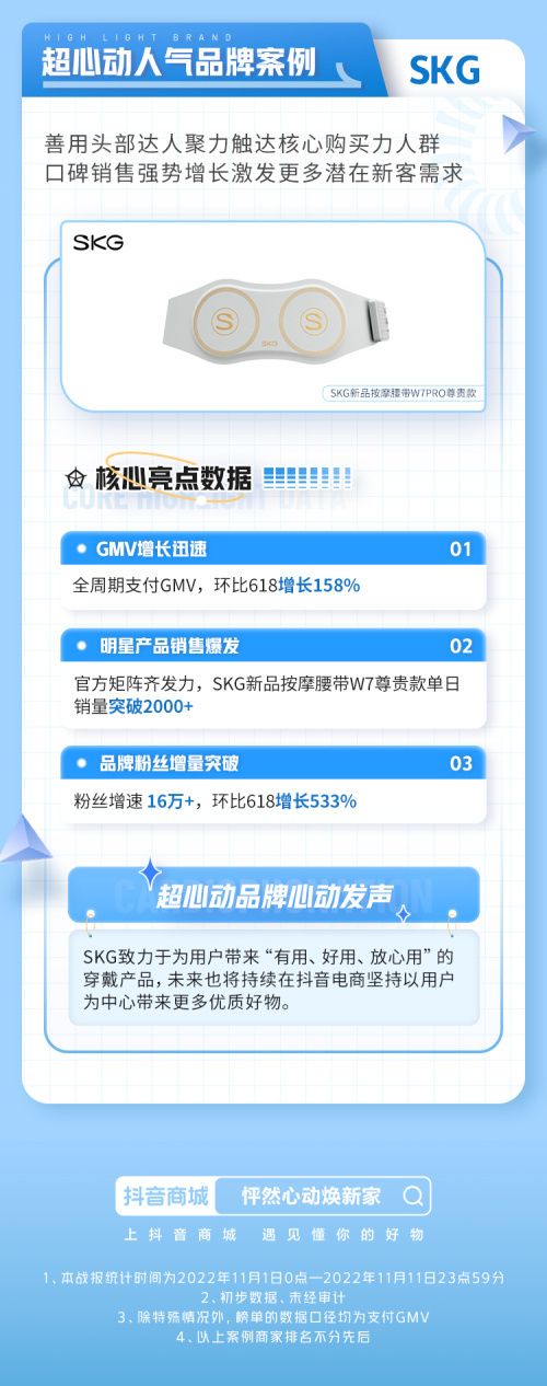 伴随抖音电商生态的不断完善升级,抖音电商已成品牌商家的新品宣发阵地之一。活动期间,SKG推出2022新品发布会,邀请SKG品牌全球代言人王一博来到SKG抖音官方旗舰店直播间,并在发布会当天在官方直播间策划了“总裁驾到”狂送福利等多重营销策略,最终促使新品按摩腰带W7尊贵款迅速成为爆品,单日销量突破2000台。至活动结束,SKG全周期活动支付GMV同比618大促增长158%。
