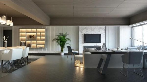 如果承重柱在客厅中间贴墙,可以与储物柜相连作为隔断,既弱化了柱体的空间棱角,又能起到划分区域的作用。