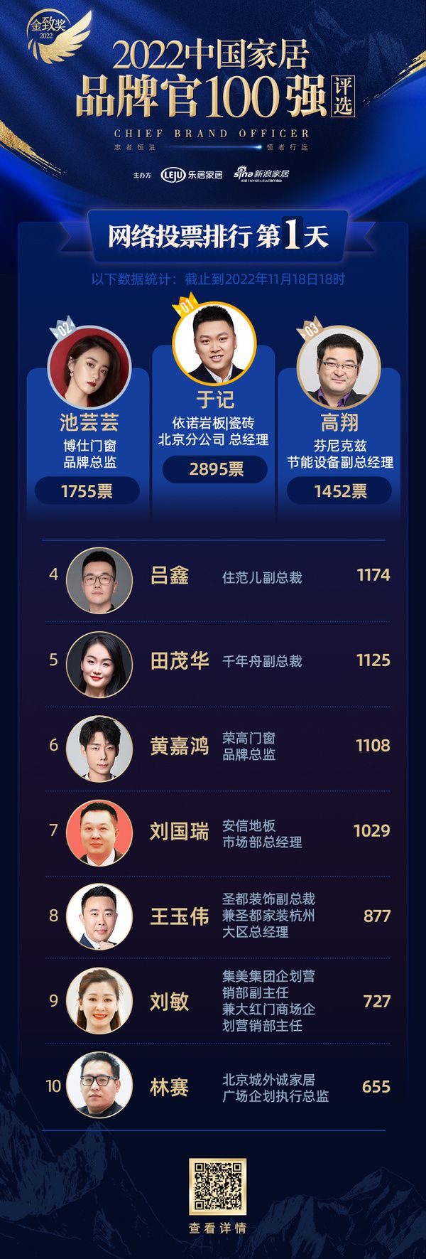 四至六名分别是:住范儿副总裁吕鑫(1174票)、千年舟副总裁 田茂华(1125票)、荣高门窗品牌总监 黄嘉鸿(1108票)、安信地板市场部总经理 刘国瑞(1029票)、圣都装饰副总裁兼圣都家装杭州大区总经理王玉伟(877票)、集美集团企划营销部副主任兼大红门商场企划营销部主任 刘敏(727票)、北京城外诚家居广场企划执行总监林赛(655票)。