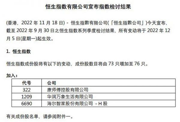 恒生指数公司11月18日发布季检结果,恒生指数成份股将由73只增加至76只,海尔智家、华润万象生活和康师傅控股3只股票获纳入,所有变动将于2022年12月5日(星期一)起生效。同时,海尔智家还被纳入恒生沪深港通中国企业指数。