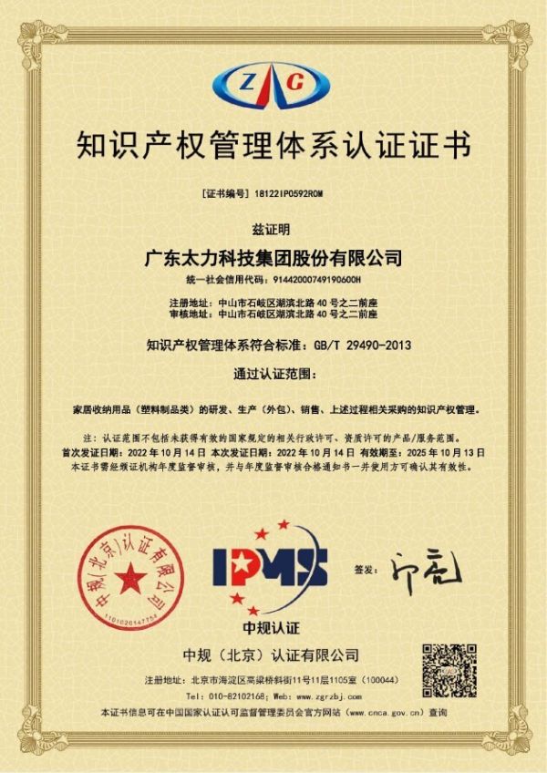 近日,广东太力科技集团股份有限公司(以下简称:太力科技)通过前期构建了知识产权管理体系,并经内部自查、内审会议评审完善体系,最终由中知(北京)认证有限公司对太力进行外部现场审核认证,顺利通过国标《企业知识产权管理规范》(GB/T29490-2013)的贯标认证,荣获知识产权管理体系认证证书,标志着太力科技在知识产权规范化管理、知识产权运用、知识产权保护等方面迈上新台阶,达到国内前沿水平。