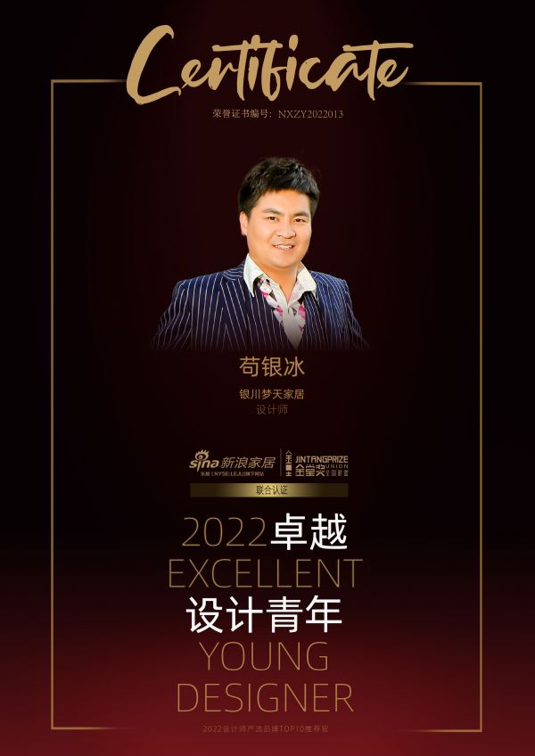 “2022卓越设计青年”由新浪家居和金堂奖全国联盟发起,是设计业界最具传播价值的年度先锋荣誉,新浪家居与金堂奖联名认证。旨在发掘和表彰室内设计领域表现卓越的杰出青年设计师。设计师苟银冰荣膺“2022卓越设计青年”称号。