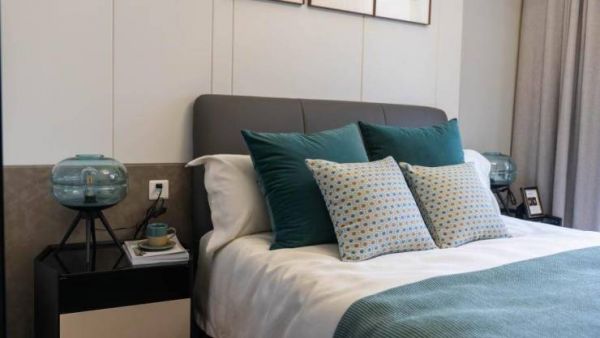 我们的卧室空间一定要私密奢适。主卧放置了1.8*2米的大床,配备两个床头柜,加整体定制柜,同样,顶部的主灯、窗帘全配齐。室内所用灯具也都是健康护眼,无频闪,无蓝光,色温可调,可以满足我们不同场景下的不同需求。