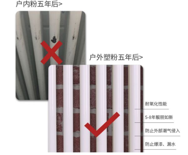 生活中,我们总是会发现一些暖气片在使用一段时间之后开始变得陈旧,白色变成了米黄色,掉漆、腐蚀蜕皮等现象时有发生。米兰春天暖气片使用的是户外塑粉,抗氧化和耐腐蚀性能更优,使用5-8年依然靓丽如新。