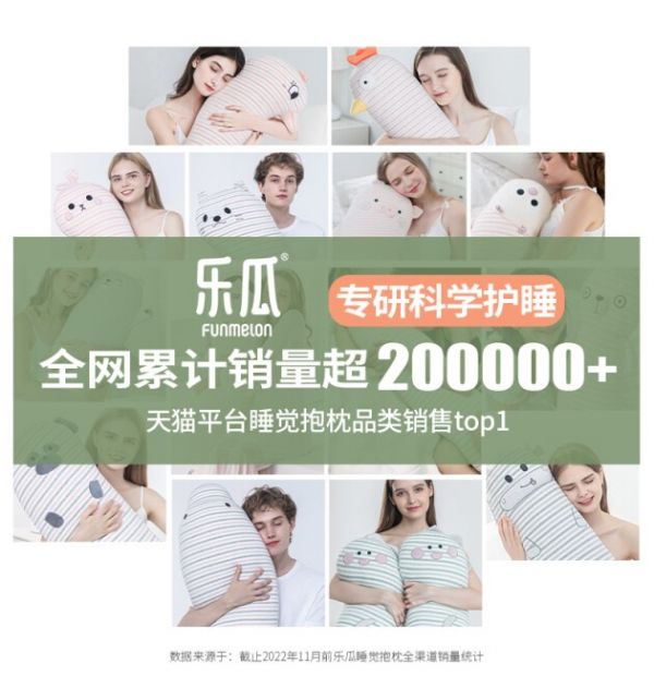 乐瓜成立于2017年,仅用了5年时间就登上了天猫的睡觉抱枕品类销售top1,全网销售量20w+,收获了无数的消费者的认可和好评。