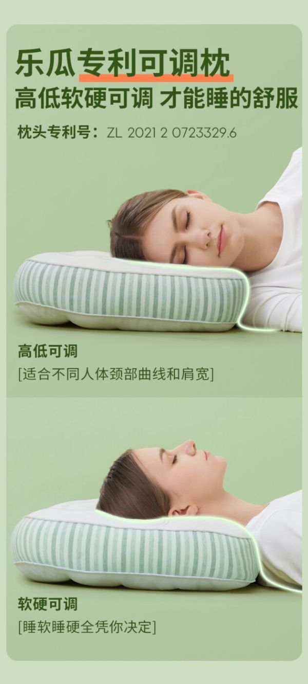 乐瓜这款乐瓜可调节高低软硬护睡枕区别于传统的一体枕,它针对不用人体的睡眠需求,乐瓜提供了4项可调节技术,可根据自身睡眠需求调节枕头的高低软硬,已获得国家专利和通过了瑞士SGS检测。