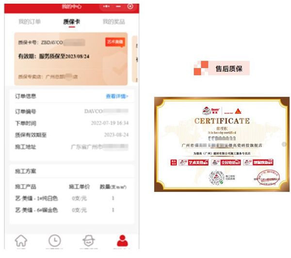 质保卡信息齐全,业主随时随地可查询,并且可一键联系官方专卖店!