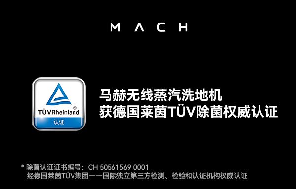 这种“马赫速度”来自于其强大的高端清洁产品矩阵带来的源动力,尤其马赫V1 Ultra无线蒸汽洗地机,更是实现110℃高温蒸汽去顽渍,该项技术属于全球首创,并凭借雄厚的科研实力荣获德国莱茵TÜV除菌认证。据了解,德国莱茵TÜV成立于近150年前,是检测服务提供商之一,也是全球最具影响力的认证服务机构之一。作为第三方检测、检验和认证机构,德国莱茵TÜV认证服务几乎涉及所有的商业和生活领域,更是安全和品质的代名词。能够获得莱茵TÜV权威认证,足见其强悍性能和卓越品质。