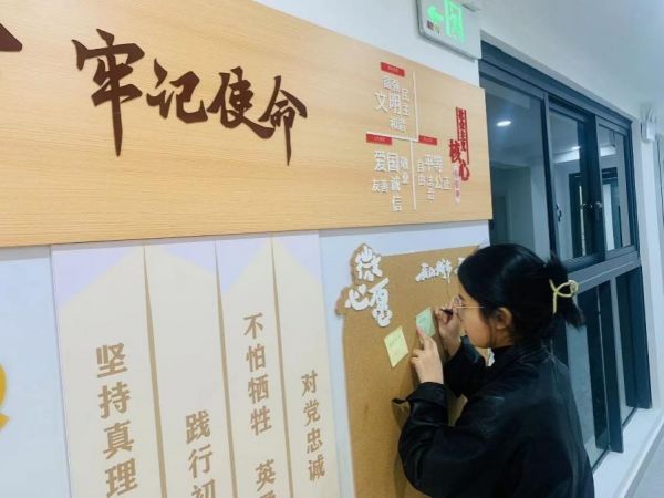 在二十大召开期间,服务站的留言板上留下不少租户满溢着青春与奋斗之感的寄语:“喜庆二十大,共画同心圆”、“青春永随党,奋进新征程”等。
