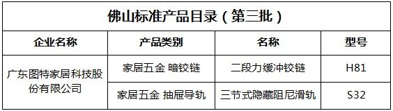 近日,佛山市市场监督管理局印发《佛山标准产品目录(第三批)》,在高标准的引领之下,图特暗铰链和抽屉导轨两类产品入选佛山标准产品目录。代表着图特五金坚持践行高标准、严要求、高品质的生产要求获得了政府和行业的充分肯定!