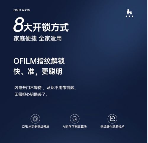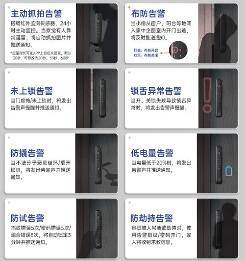 防劫持告警等8大智能告警守护门内门外安全,避免不小心、不经意带来的危险,全面提升安全指数与幸福感。8种开锁方式,既有创新,又传承传统,满足不同消费人群、不同场景的入户需要,守住安全与安心的同时,不失礼仪,让临时到访的亲朋入屋稍坐静等。