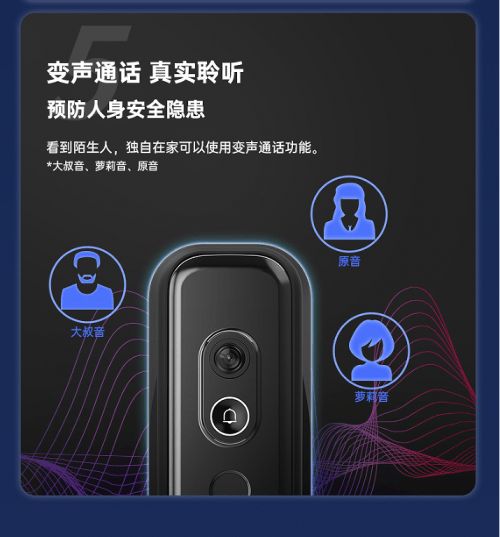 加装变声技术,主动驱赶危险,独居女性或老人幼童可借此功能让可疑来访者知难而退;同时,加配夜间侦查级别的微光夜视技术,增加夜晚居家安全系数,日日夜夜收获居家安全。