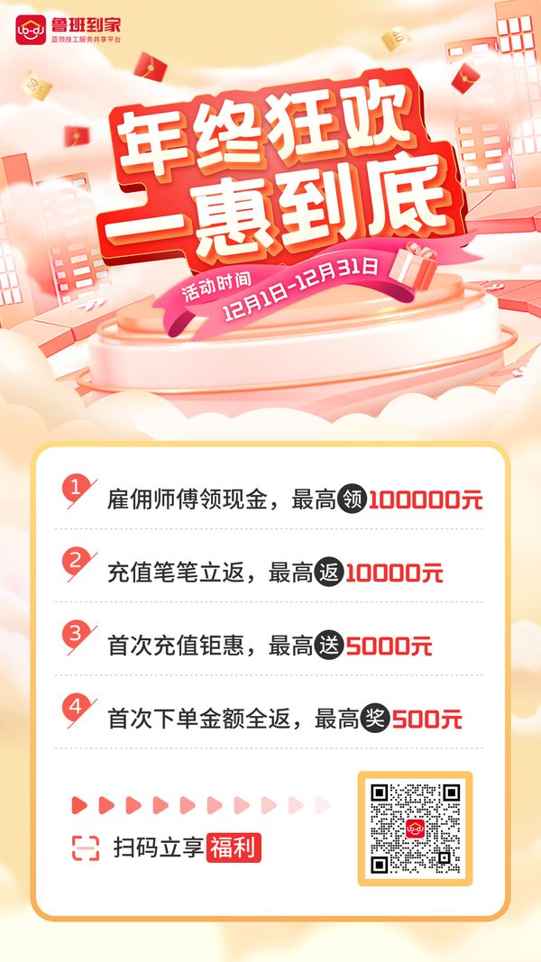 此外,为进一步回馈平台商家,鲁班到家双十二优惠活动也重磅推出,雇佣师傅最高领100000元、充值笔笔立返最高返10000元、首充钜惠最高送5000元、新人下单全额返单笔最高返500元。