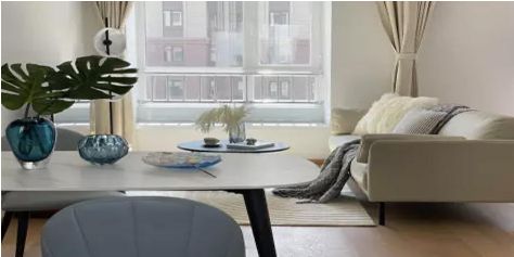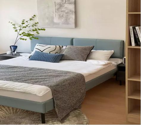 客厅选用灰色爵士沙发,餐厅采用贝壳岩板餐椅,这样的一个配置既有舒适的休闲空间,也有多人欢聚时的共享空间,可以在沙发上肆意瘫,也可以在餐厅尽情享受美食。睡眠区域定制爵士可调节床蓝色款,外观轻巧不占据空间的同时也为年轻人的睡眠提高保障,床头的斜靠角度可以调节,倚靠不需要靠枕配合坐姿,消除一天工作的疲惫,床头柜是无线充床头柜,方便给手机充电,让日常更便捷。