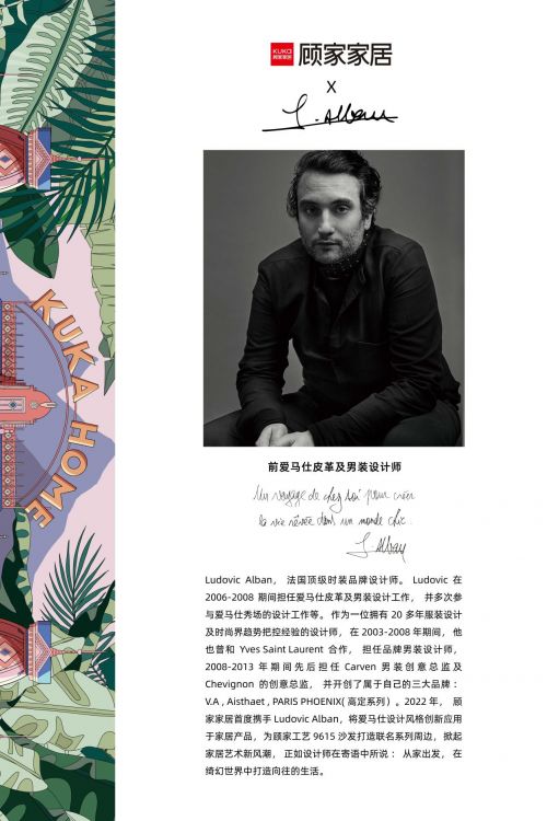 作为一位拥有20多年服装设计及时尚界趋势把控经验的设计师,Ludovic Alban对皮革和爱马仕风格的设计可谓融入骨血,此次和顾家家居的首度携手,将最得心应手的元素作用于家居产品,为顾家工艺9615沙发打造了联名系列周边——限量版绮幻舞步丝巾,设计灵感完全来源于9615舞这款产品的设计灵感,以灵动为内核,设计师构想出了一场由艺术马车踏着奇幻舞步的惬意场景,结合卢梭及其笔下热带丛林风光的元素,通过一场奇幻与华丽艺术的奇遇,打造了一座浪漫的9615艺术之城。,通过不同的表现形式实现艺术的同频共振,绽放出对生活的相同热爱。正如Ludovic Alban在寄语中所说的那样——从家出发,在绮幻世界中打造向往的生活。