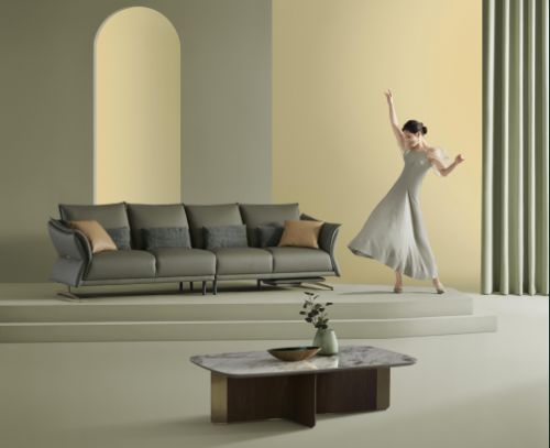 正是出自对生活的热爱和对时尚的追求,这款9615舞沙发也被赋予了自由起舞的热烈与优雅。以“舞”为起点,Ludovic Alban将舞者的悠扬舞姿、轻盈步调、优雅气质融入沙发的设计中,橄榄绿 一种轻松而诱人的绿色,承载着生命的律动,浓郁的色泽中夹裏着磅礴的生机。坐垫以中高靠背丰盈支撑,57cm的大坐深打造出舒适坐感,双侧的双层扶手优雅且极具张力,造型如舞者起势,外坚内柔,外层姿态提拨释放张力,内层飘逸柔软轻盈柔美,曲线灵动。16cm冷香槟色“工”字金属脚简洁优雅,轻薄而笔直的线条,如舞步轻盈流畅,两端点地,如舞者足尖,坚挺有力,不仅提升了整个空间的调性,同时也能展现出顾家工艺技术精湛,让空间在极简优雅中展现出生活品味。