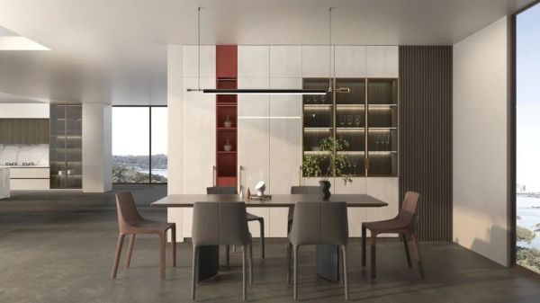 珊瑚·印象系列餐边柜与护墙板一体设计,简约纯粹,一抹珊瑚红点亮了空间装饰的浪漫。色彩映衬和贴心功能,形成精致又有序的储物空间。