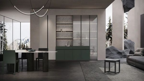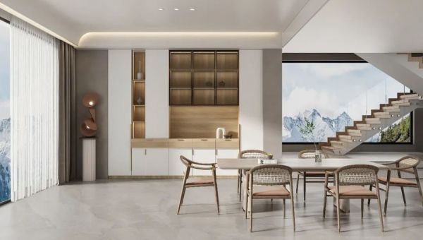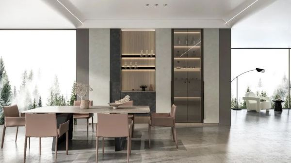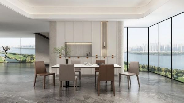 莫兰迪系列餐厅空间,使用大面积镀膜玻璃门设计,在视觉上拉伸空间,让收纳充满格调。餐厅地柜采用不共面设计,让设计更实用。