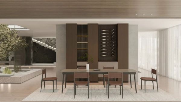 国色系列柜体使用流金科技木,媲美原木皮家具;金属酒架陈列细密,内置银镜和灯光增加空间反射深度;悬吊式开放架既有展示力,也加深中式韵味。