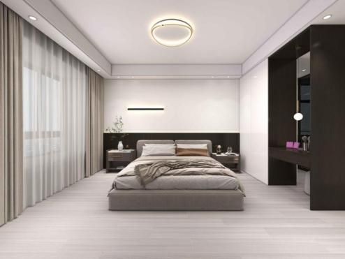 次卧以简洁为主,黑白色一柜到顶的衣柜提升了居住的舒适度,搭配自带纹理的灰色木地板低调又不失内涵,展现出相得益彰的极简风格,沉静自在的极简氛围油然而生。