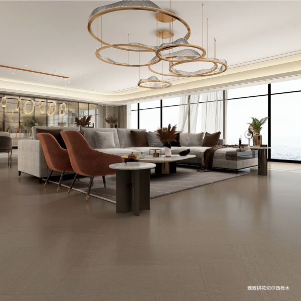 拼花地板自带优雅的贵族气质,不同的拼花图案或为空间增添了灵动感,或彰显空间的精致与奢华。在大面积空间中,拼花地板更容易彰显出它的装饰属性,丰富整体空间的视觉层次,提升空间的质感。卢森地板有很多拼花地板,人字拼、鱼骨拼等。一横一竖一撇一捺之间提升了空间的艺术价值。上图中为卢森地板那慕尔雅致切花切尔西栎木,与传统的人字拼来对比,它的规格更大。地板的长宽比是1:3,这样规格的拼花地板让大宅空间更立体明快,丰富了空间的层次感。卢森地板那慕尔系列诠释了“高级感”应有的色彩与格调,营造出大宅空间的时尚魅力。