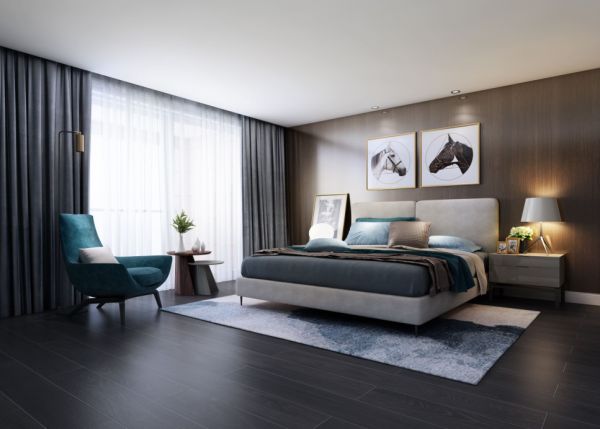 小户型选择地板的时候会有空间大小与采光效果的局限性。大空间的地面有了更多的选择余地。拿深色地板来说,现在很多大宅会选择较深颜色的地板来铺装。地板的深色本身从视觉上就有一种大气沉稳的属性,地板如果像卢森地板这样有自然的花纹与真实的肌理感,更能展现空间时尚与精致感。像上图大面积的卧室空间,如果颜色浅淡会容易产生空荡的孤寂感,反而是较深颜色的地板让空间显得高雅而舒适!