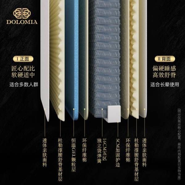 DOLOMIA的厚奢级弹簧凝胶床垫,30CM厚1300根独立袋装弹簧,表层结合凝胶层吸压固脊,突破层层技术壁垒,在奢华床品界的翘楚地位无可置疑,光是其自身的高维超性能凝胶与重奢黑尊基材的融合研发就耗资7百万美元,。在经过其一系列奢华深睡产品上市后的飞速发展后,DOLOMIA现已经发展成为全球高端的奢华睡品制造商之一,荣登国际睡品top5榜单。