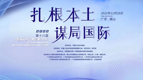 2022年11月28日,「扎根本土,谋局国际」第十六届中国厨卫行业高峰论坛在佛山召开。活动由中国工业合作协会指导,中国工业合作协会家居整装分会、厨卫资讯、陶卫网主办,中国陶瓷总部基地/中国岩板·新材展示采购基地协办,广东尚驰智能家居科技有限公司、九牧厨卫股份有限公司、广东东鹏整装卫浴有限公司、广东金恩卫浴有限公司、广东圣洛威卫浴洁具有限公司、广东华艺卫浴实业有限公司、和成卫浴(上海)有限公司、广东新中源住工新材料有限公司、卫浴材料城支持。