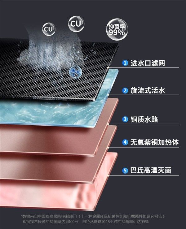 99.95%高纯度T2无氧紫铜作为发热体核心,高达98.1%的发热效率满足即开即热的同时,实现杀菌、抑菌。