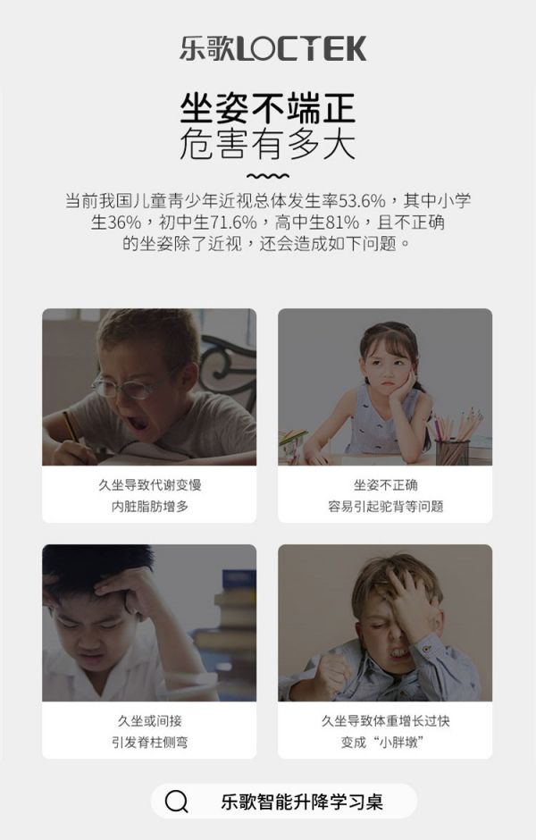 长期伏案学习,如果坐姿不正确,用眼不当,对儿童视力伤害非常大。而且许多家长虽然会有意识地纠正小孩的坐姿问题,却不知道解决不当用眼问题除了家长的耳提面命,还可以利用一套合适的学习桌椅来营造一个良好的学习环境,去改善孩子的日常用眼和日常学习习惯。