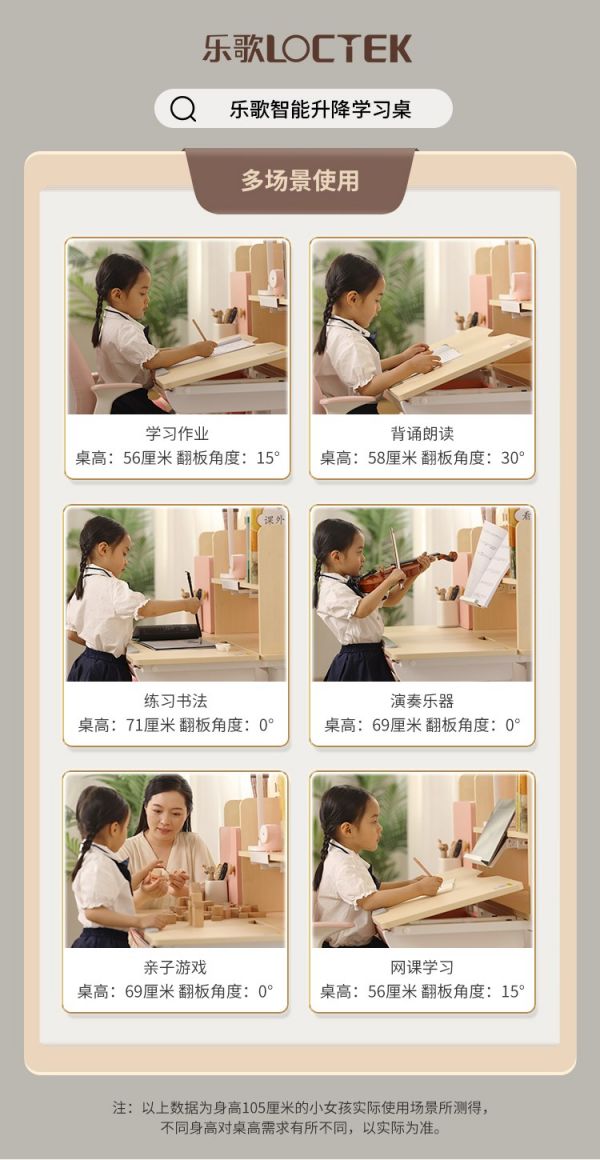 一张合适的学习书桌不仅需要与孩子的身高适配,还需要满足写字、上网课、阅读、画画等不同场景的学习需求,这些场景对桌子高度的需求是不同的,如果书桌无法调整高度,日复一日的“同一高度”,势必会对孩子的视力和成长发育造成影响。