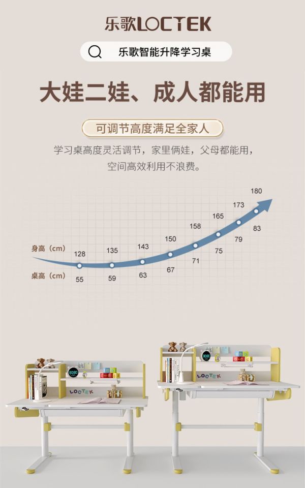 与此同时,处于生长发育期的儿童身高变化很快,想要很好的契合不同身高的需求就需要桌子高度的及时调整,乐歌智能儿童学习桌0.6米-1.25米之间的大范围升降则刚好可以满足这一需求,桌面高度随心调节,一升一降之间对孩子的健康发育和成长做到了完美的呵护,真正陪伴孩子从童年用到成年。
