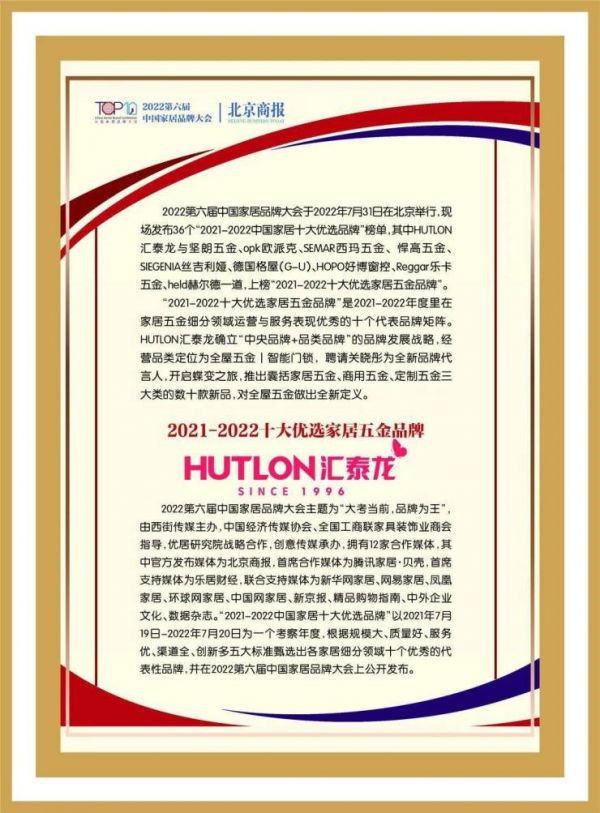 以“大考当前,品牌为王”为主题的2022第六届中国家居品牌大会在北京举行。现场发布了“2021-2022中国家居十大优选品牌”36个榜单,汇泰龙凭借出众的产品力、品牌力与优质服务,连续三年上榜“十大优选家居五金品牌”。