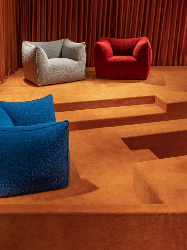 出于这些全新特性的考量,设计师Paul Hsu别出心裁地通过场景化的构建呈现“小岛公园”这一概念,以建筑体量感的表达方式创造沉浸式的游览体验。走入这座洋溢着浓厚古典风情的百年建筑,缤纷绚丽的视觉装置瞬间映入眼帘——略呈倾斜坡度的地面结构营造出宛如滑板公园般的自由氛围,蓬松地毯于表面轻柔地覆盖,与Le Bambole的全新面料——Sila带来的柔软感知巧妙呼应,既造就强烈的活力感,亦展露自然舒适的亲和力,邀请人们走近探索。全新Le Bambole分布于中央的下沉空间以及展示台各处,色彩各异的纯色版本与独特的花卉印花版本穿插其间,交织出一幅遐想丛生的梦幻景象。