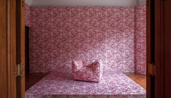 沿着主厅的斜坡继续游览,进入一间独立设置的联名展厅,B&B Italia与Stella McCartney首次合作的创意产物——以2022春夏“菌菇森林Fungi Forest”手绘图案装点的Le Bambole限定版本于此处惊艳亮相。从扶手椅的饰面到展台,再到整个房间的每一面墙壁,这一富有冲击感的鲜活图案在眼前大片地铺展开来,仿若植物无限蓬勃地向四周蔓延生长,以强劲的生命力将感官细胞全方位地包围。手绘图案菌菇森林的印花墙纸是英国品牌Cole & Son作品中最具可持续发展特色的环保墙纸之一。菌菇森林墙纸亦作为此次展出Stella McCartney X B&B Italia 特别版Le Bambole的背景。