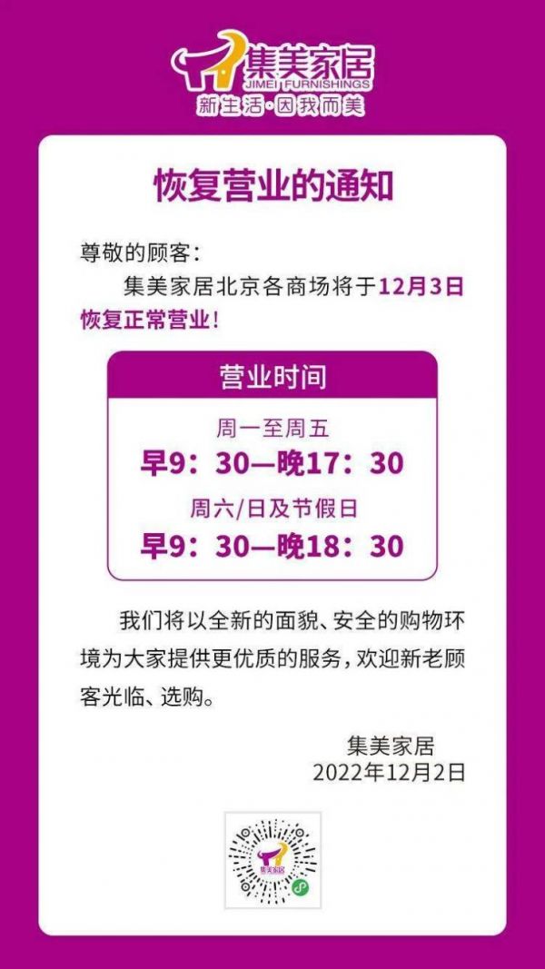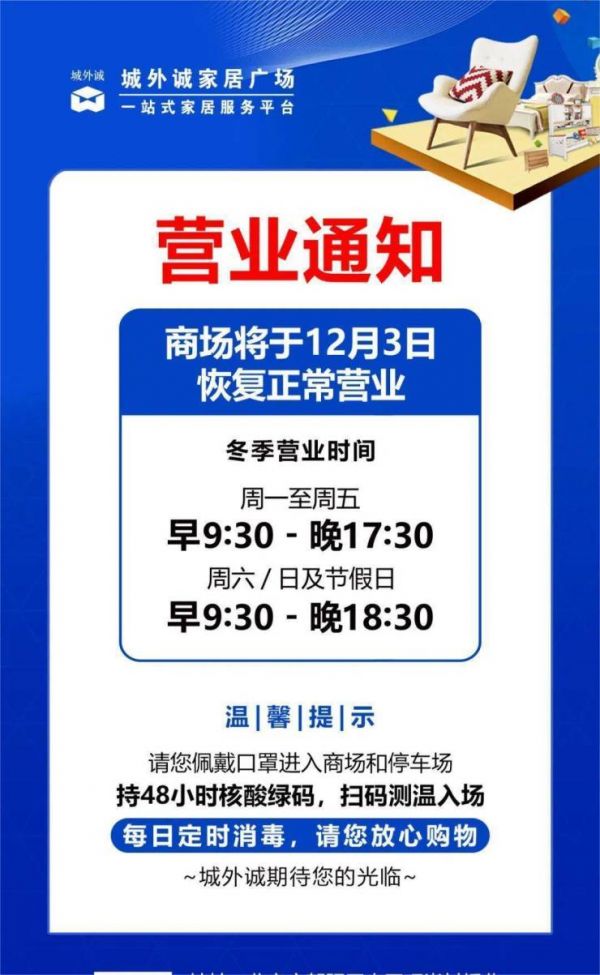 近期,北京多家商场陆续恢复营业。12月2日,北京集美家居、城外诚家居两大家居卖场发布营业通知。北京城外诚家居广发通知,城外诚商场于12月3日(今日)恢复正常营业,消息显示,城外诚冬季营业时间为周一至周五9时30分-17时30分,周六/日及节假日为9时30分-18时30分;同日集美家居发布消息称,集美家居北京各商场于12月3日恢复正常营业,营业时间为周一至周五9时30分-17时30分,周六/日及节假日9时30分-18时30分。商场提示消费者佩戴口罩进入商场和停车场,持48小时核酸绿码,扫码测温入场。