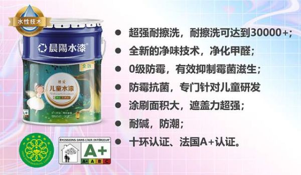 (4):孩子好动会把墙壁弄脏难清除,所以要选耐污、易擦洗性能的,这样可以轻松冲洗墙面污渍。晨阳水漆这款稚爱儿童水漆采用荷叶抗污技术,漆膜在墙面形成保护层,耐沾污宜清理。