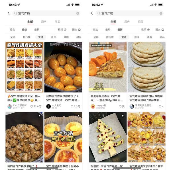 再加之,用户们自发性地在小红书、抖音、微博等社交媒体平台上分享丰富的食谱制作方法和创意延展内容引爆口碑,极大程度地调动了消费者购买热情;另外,各大品牌也纷纷通过官方安利教学和KOL达人铺量种草推荐提升曝光量;与此用时,平台搜索引擎的算法机制也在一定程度上起到了推波助澜的效果,使得空气炸锅成为了火热的香饽饽。