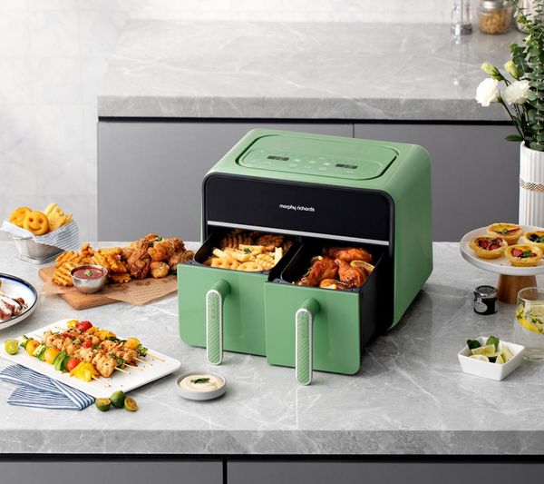 比如摩飞MR8100双仓空气炸锅,有清新绿、奢侈蓝和椰奶白三种配色;四方形的机身搭配黑色显示屏,当机器开始烤制时,炉灯亮起,透明大视窗可以随时观察食物动态;独立双胆(4L+4L)大容量和NTC分区控温设计,双锅可同时进行不同的食材烤制,不仅省时,还不会串味!双重3D旋涡底盘,720度立体高速加热,360度全方位包裹,不用担心受热不均匀,真正烹饪出外焦里嫩的食物;还有预约功能,断电记忆,防烫手柄等贴心小设计,暖心又好用,迎合了现阶段的产品迭代趋势。