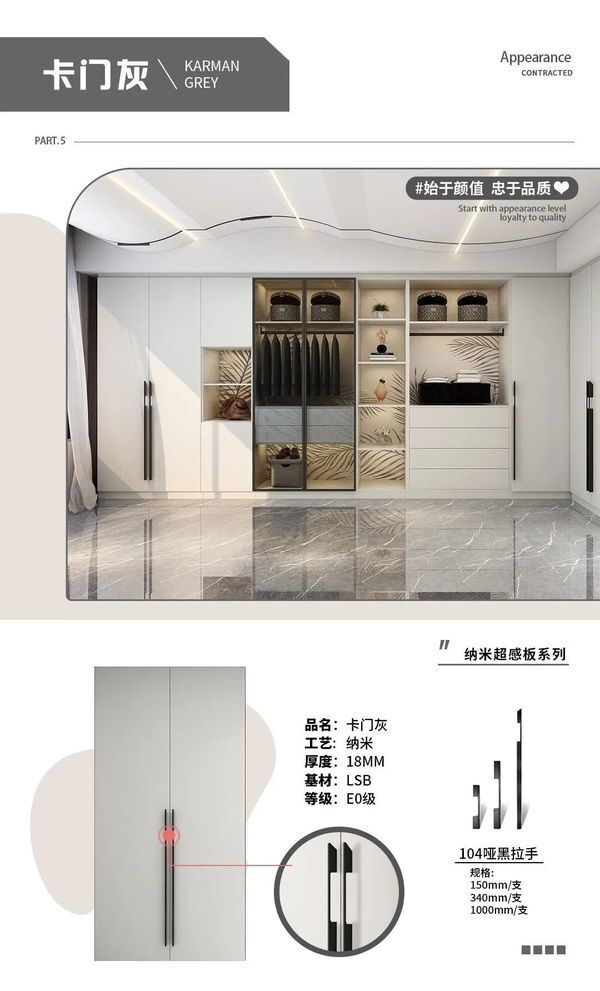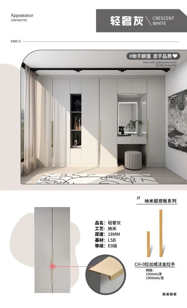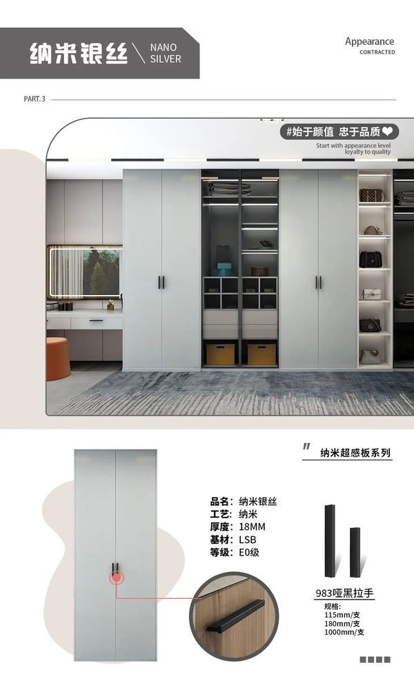 纳米超感板从产品开发就解决了柜体、柜门同色的设计需求,4款纹理、4款纯色,可以形成不同的花色搭配组合,也可以柜门、柜体通用。