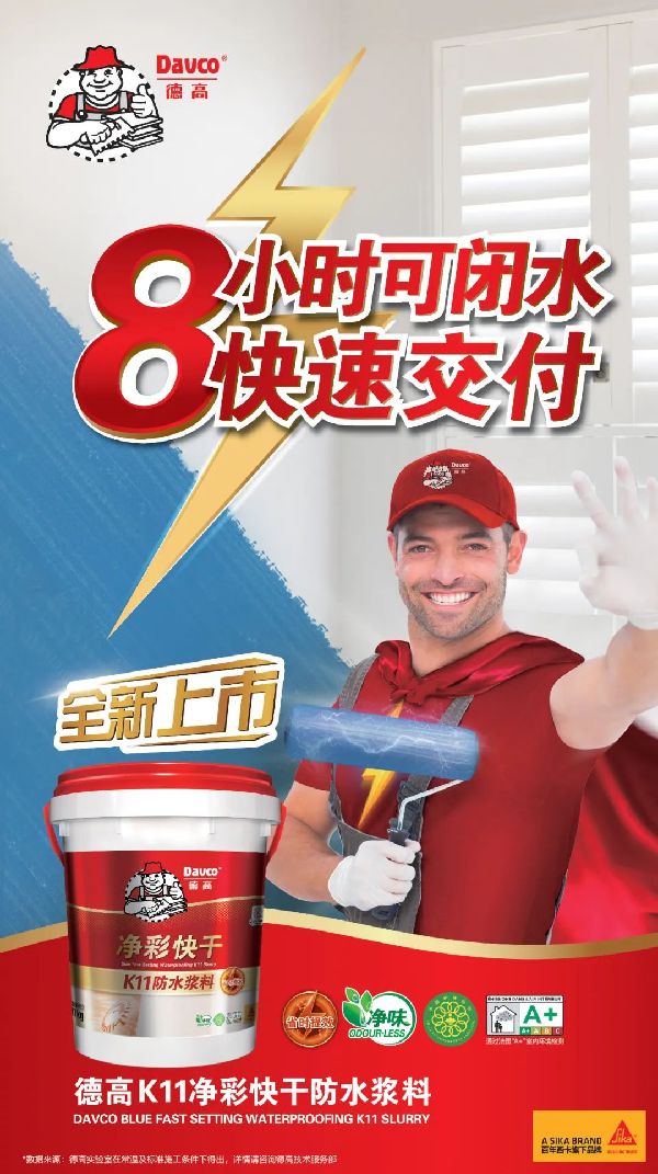 德高K11净彩快干防水浆料,滚涂快、干得快、完工快,冬天施工,也可以拥有夏天的高效率。