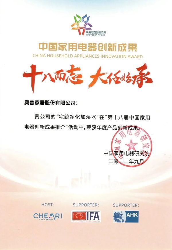 宅鲸加湿器受到了权威机构的认可,在“第十八届中国家用电器创新成果推介”中荣获“年度产品创新成果”,得到市场和消费者的一致认可。