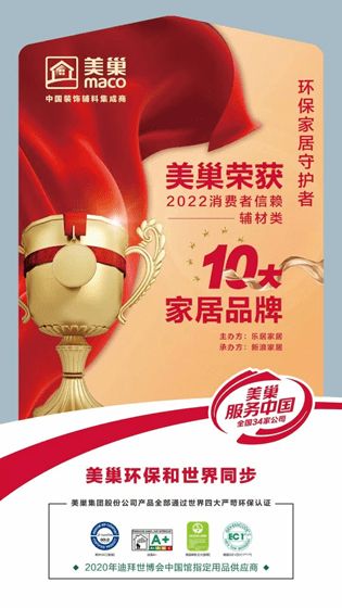 “2022消费者信赖十大家居品牌”评选活动,以“家居行业高质量发展,扎实推进优质品牌建设”为宗旨,通过对产品品质、服务质量、消费口碑、品牌影响力四大维度综合评审。美巢凭借世界水平的环保产品、美巢服务中国的市场布局、良好的消费者口碑及深耕多年的品牌影响力荣登“2022消费者信赖十大家居品牌”辅材类榜单。