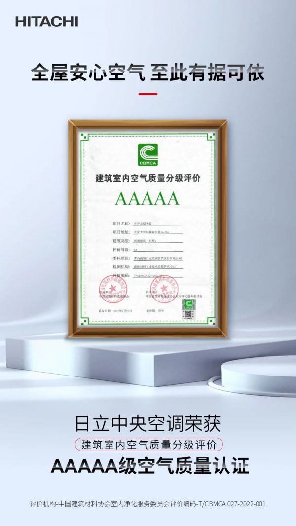 据了解,标准以室内空气中的甲醛、苯、臭氧、二氧化碳、PM2.5等13个指标为依据,将建筑室内空气质量划分为三个等级。其中日立中央空调获得“5A级”,表明空气质量为最优,是标准中的最高等级。