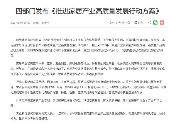 今年年中,工业和信息化部、住房和城乡建设部、商务部、市场监管总局联合发布《推进家居产业高质量发展行动方案》(以下简称《方案》),提出到2025年,家居产业创新能力明显增强,高质量产品供给明显增加,以高质量供给促进家居品牌品质消费。家居行业作为重要的民生行业,《方案》的提出对其发展提出了新的要求,明确以打造高质量产品与服务为目标,不断为满足人民美好生活的需求而努力。