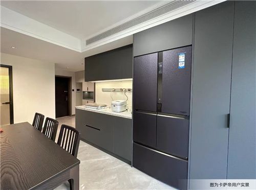 在厨居美学方面,卡萨帝冰箱不但率先实现了“两侧零嵌”,还进一步重塑嵌入标准,做到了“平嵌”,不仅在厚度上能够轻松嵌入深600mm、宽800mm的标准橱柜,而且90°直角开门时也不影响抽屉使用,大角度开门也不会碰壁。不仅如此,冰箱还有与橱柜踢脚、腰线齐平的追线设计,真正实现了“线线相通”。