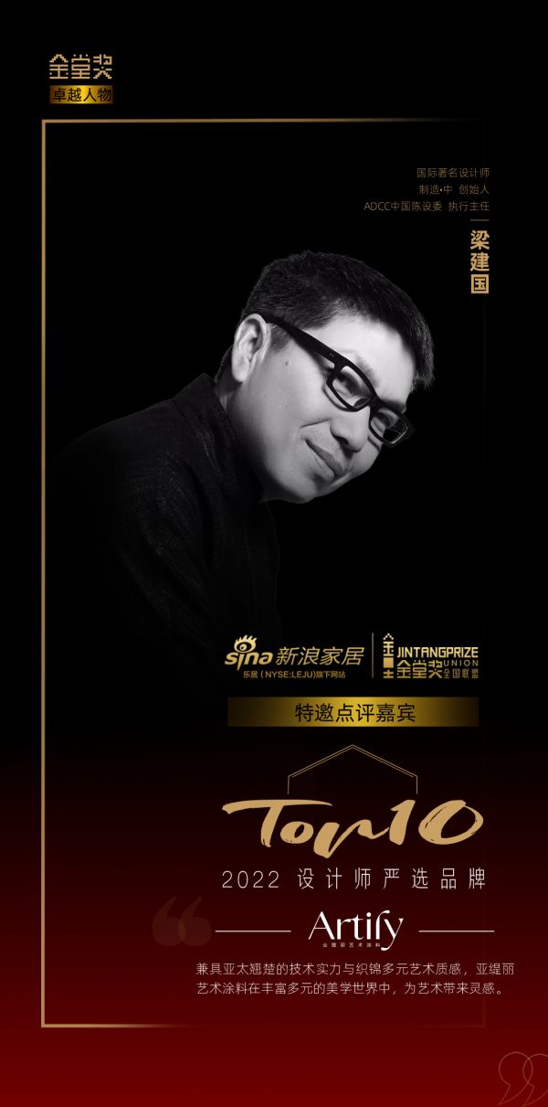 金堂奖卓越人物、国际著名设计师、制造·中 创始人、ADCC中国陈设委 执行主任、金堂奖全国特邀点评嘉宾梁建国对亚缇丽上榜表示祝贺,并点评道:兼具亚太翘楚的技术实力与织锦多元艺术质感,亚缇丽艺术涂料在丰富多元的美学世界中,为艺术带来灵感。